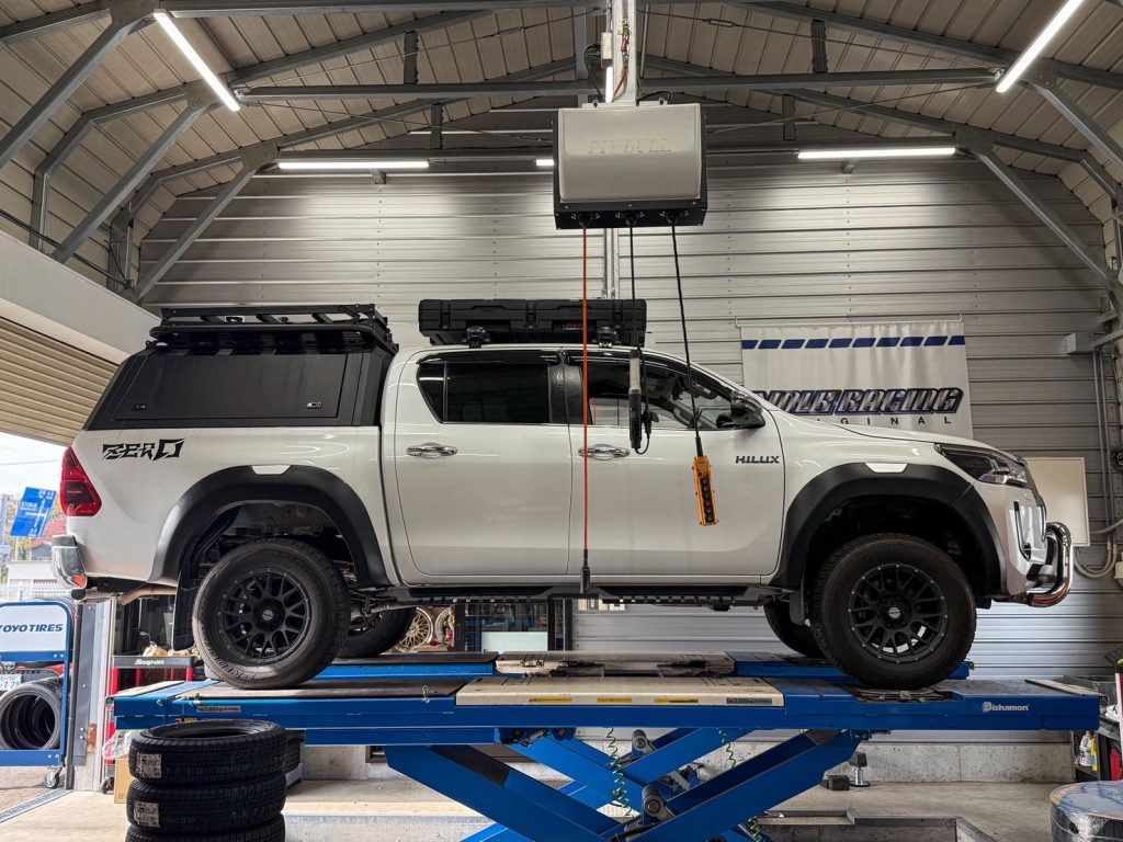 リフトアップハイラックスの場合はキャスター角、キャンバー角は通常通り調整ではありません、、