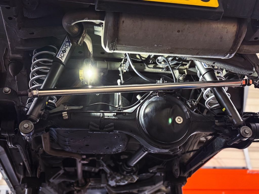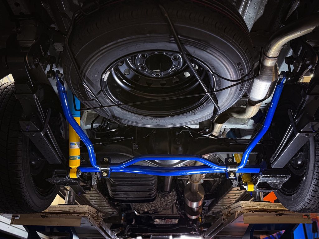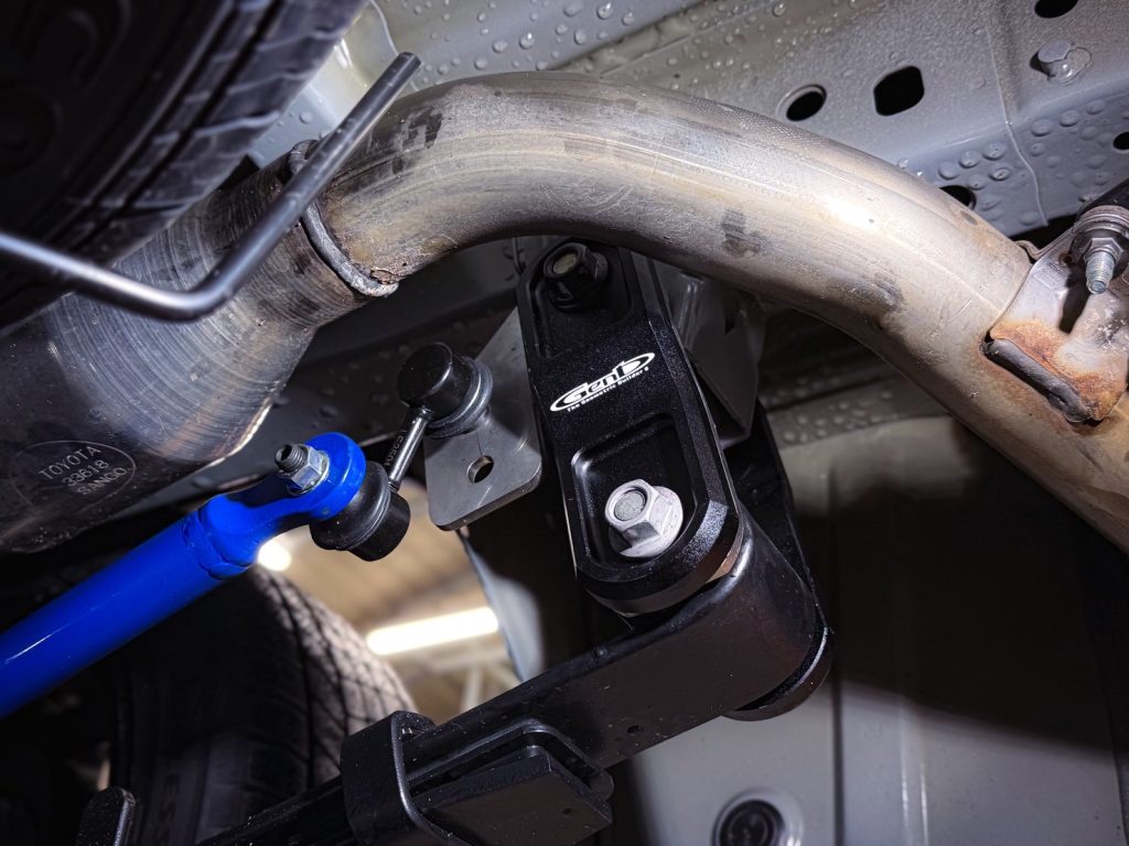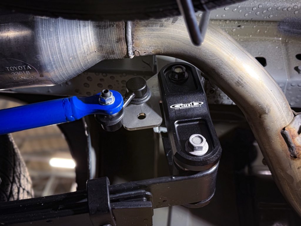 クスコ製リア追加スタビライザーのブラケットもこのシャックル部分に装着するため通常は同時装着ができませんが、当店オリジナルの「リアスタビリンクプレート」を装着するとで加工なく併用可能💨