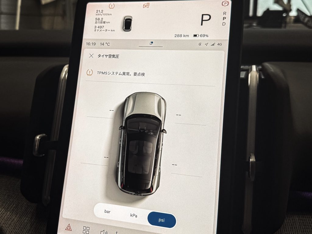 冬タイヤは通常のゴムバルブが装着されて車内のモニターには空気圧の異常を知らせる警告が表示されていました👀
